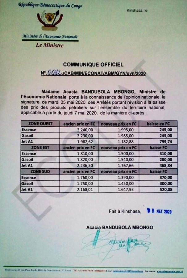 La ministre de l’économie nationale, Acacia Bandubola a signé mardi 05 mai 2020, un arrêté portant révision à la baisse des prix des produits pétroliers sur l’ensemble du territoire national.