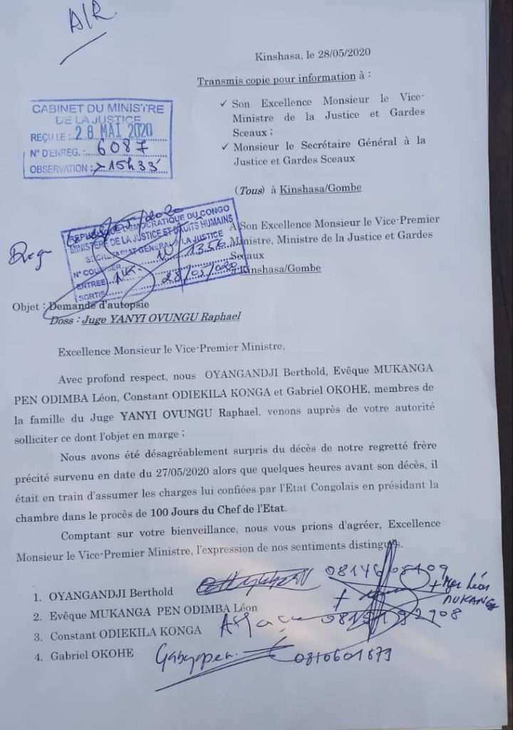 La Famille biologique du Juge Raphael Yanyi Ovungu, a sollicité ce jeudi 28 mai 2020, dans une correspondance adressée à son excellence Monsieur le vice Ministre de la justice et gardes des sceaux, l’examen d’autopsie du Juge président du tribunal de Grande instance de Kinshasa-Gombe, Raphael Yanyi Ovungu décédé mercredi 27 mai 2020, aux environs d’une heure du matin.