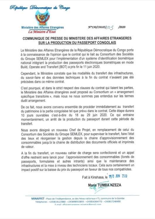 Le ministère des Affaires étrangères de la République démocratique du Congo, a, par le biais de sa ministre Marie Tumba Nzeza, annoncé dans un communiqué de presse, que le contrat qui le liait au consortium des sociétés du Groupe SEMLEX pour l’implémentation d’un système d’identification biométrique national intégrant la production des passeports électroniques biométriques en mode Build, Operate and Transfert (BOT), a pris fin le 11 juin 2020.