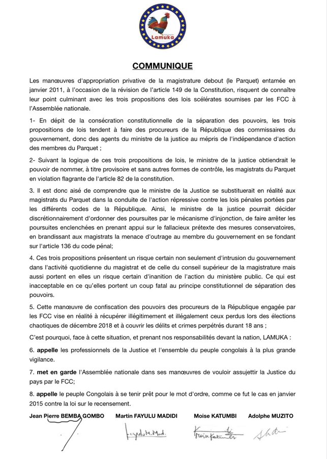 La coalition Lamuka a, dans un communiqué publié ce mardi 23 Juin 2020, déclaré que les trois propositions des lois sur la reforme judiciaire sont « inconstitutionnelles » et portent « un coup fatal au principe constitutionnel de séparation des pouvoirs ».