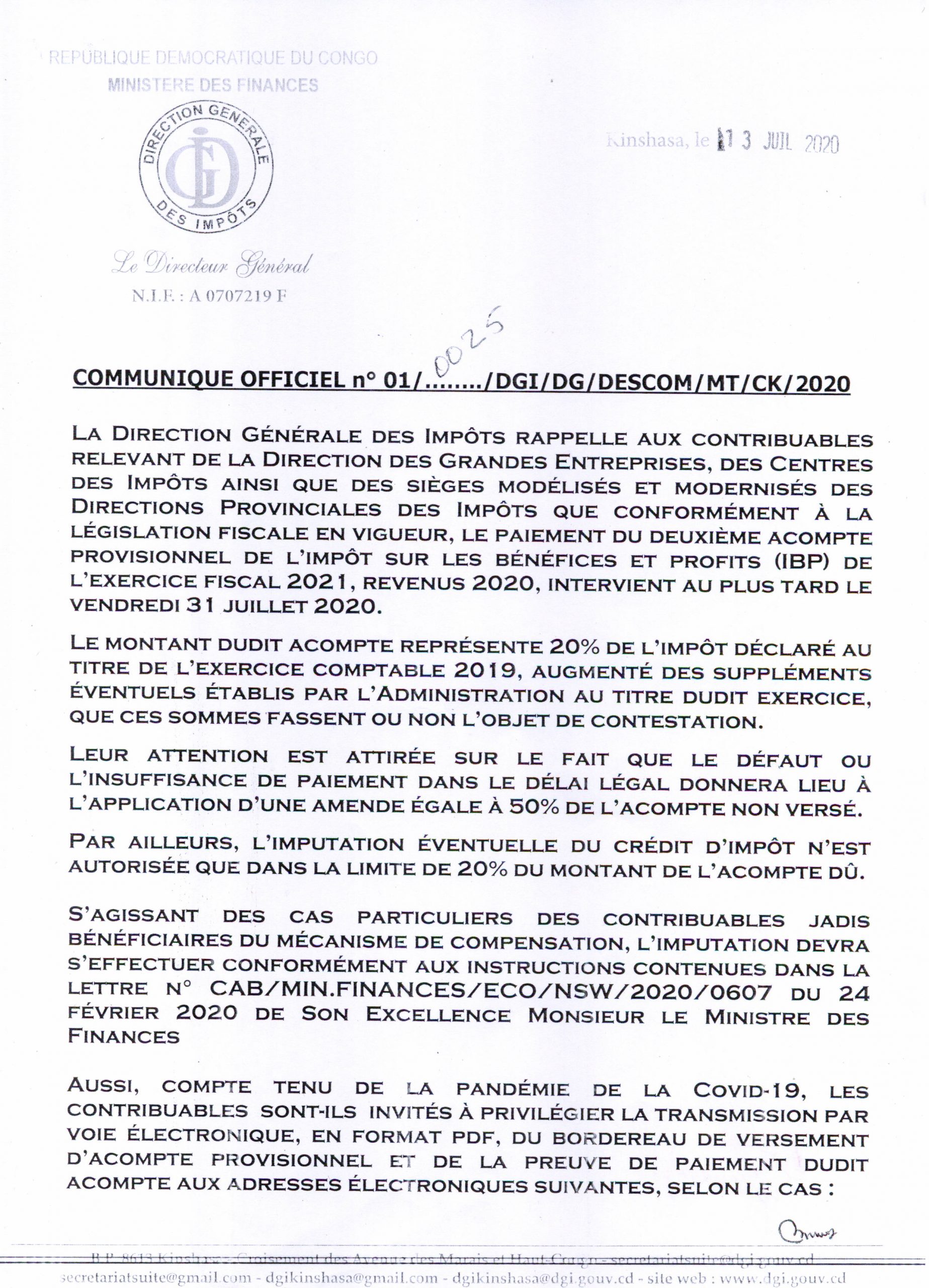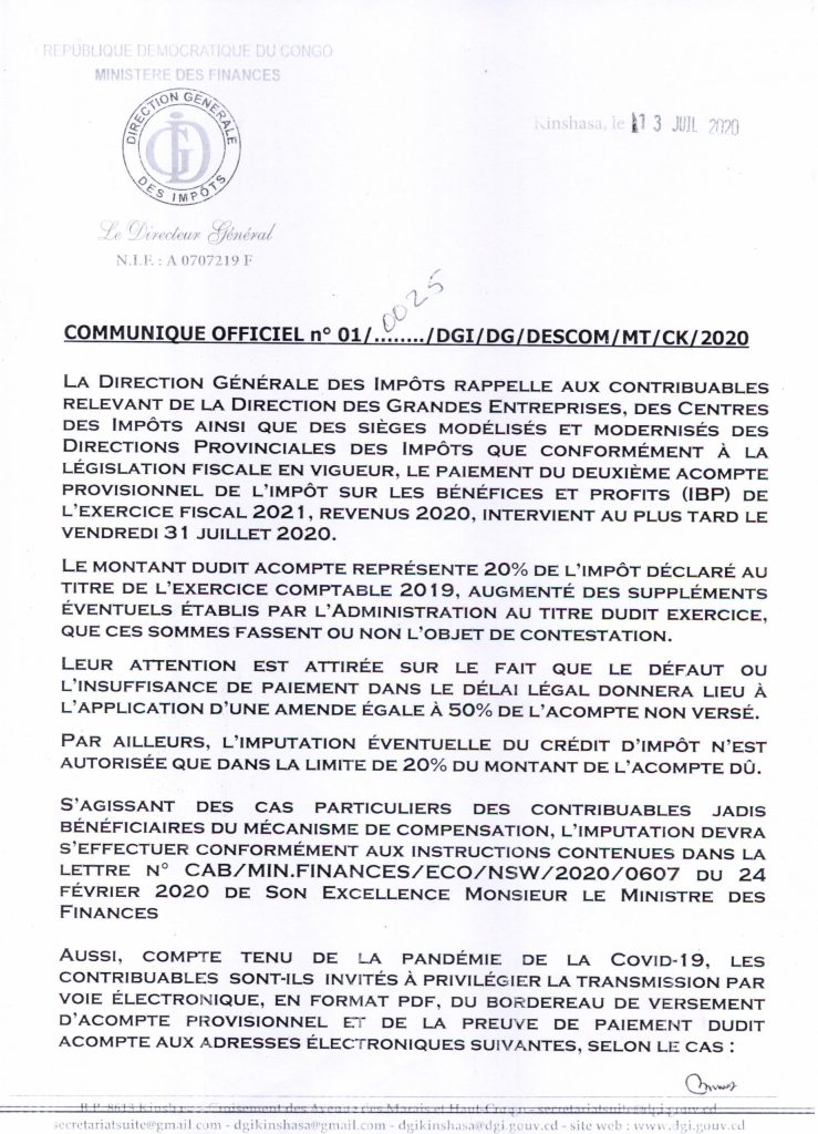 LA DIRECTION GÉNÉRALE DES IMPÔTS RAPPELLE AUX CONTRIBUABLES RELEVANT DE LA DIRECTION DES GRANDES ENTREPRISES, DES CENTRES DES IMPÔTS AINSI QUE DES SIÈGES MODÉLISÉS ET MODERNISÉS DES DIRECTIONS PROVINCIALES DES IMPÔTS QUE CONFORMÉMENT A LA LÉGISLATION FISCALE EN VIGUEUR, LE PAIEMENT DU DEUXIÈME ACOMPTE PROVISIONNEL DE L’IMPÔT SUR LES BÉNÉFICES ET PROFITS (IBP) DE L’EXERCICE FISCAL 2021, REVENUS 2020, INTERVIENT AU PLUS TARD LE VENDREDI 31 JUILLET 2020.