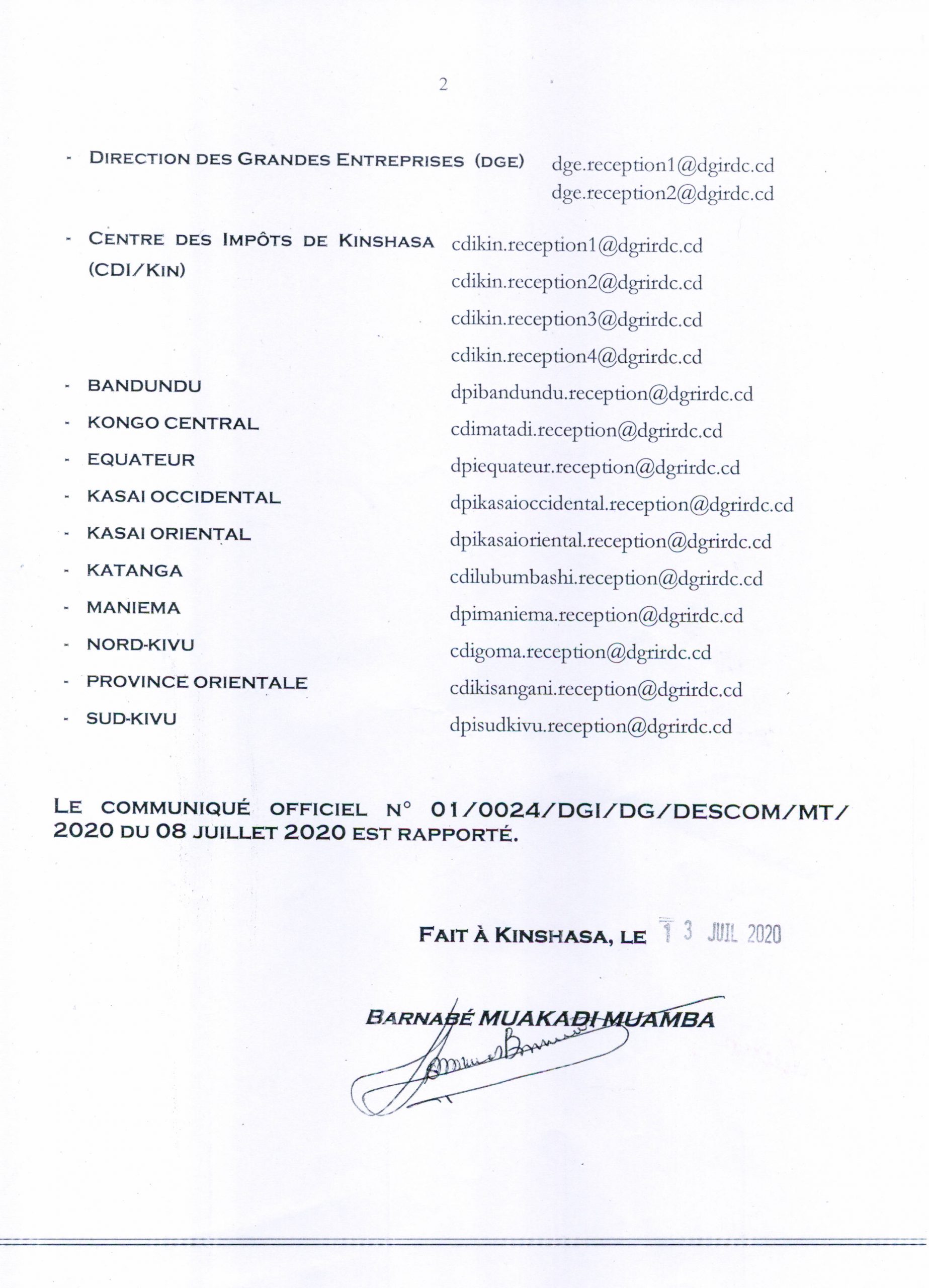 LE COMMUNIQUE OFFICIEL N°01/0024/DGI/DG/DESCOM/MT/2020 DU 08 JUILLET 2020 EST RAPPORTE.