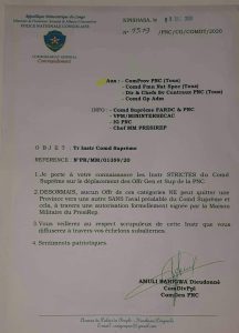« Désormais, aucun officier général et supérieurs ne peut quitter une province vers une autre sans l’aval préalable du commandement suprême et cela, à travers une autorisation formellement signée par la Maison militaire du Président de la République », écrit Dieudonné Amuli.