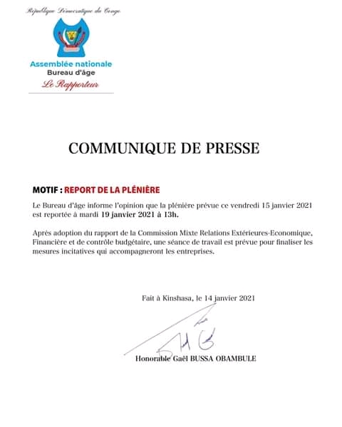 Le Bureau d’âge de l’Assemblée nationale , a annoncé ce jeudi 14 janvier 2021, dans un communiqué , le report à mardi 19 Janvier, de la séance plénière qui était initialement prévue vendredi 15 Janvier, à la chambre basse du Parlement.