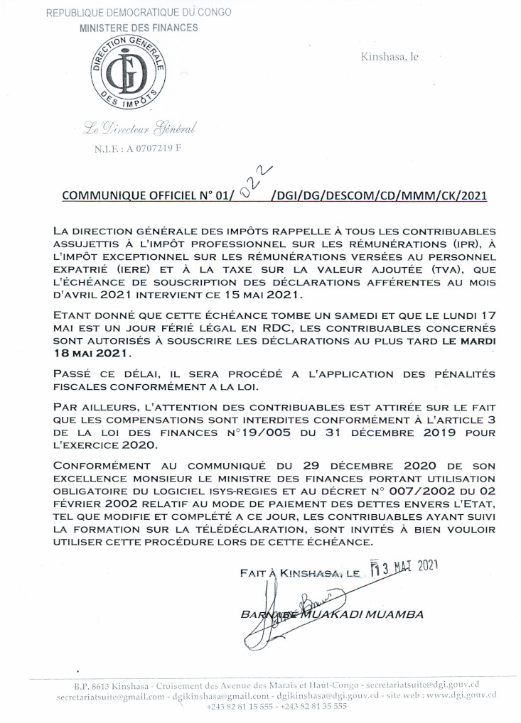 ETANT DONNE QUE CETTE ECHEANCE TOMBE UN SAMEDI ET QUE LE LUNDI 17 MAI EST UN JOUR FERIE LEGAL EN RDC, LES CONTRIBUABLES CONCERNES SONT AUTORISES A SOUSCRIRE LES DECLARATIONS AU PLUS TARD LE MARDI 18 MAI 2021.