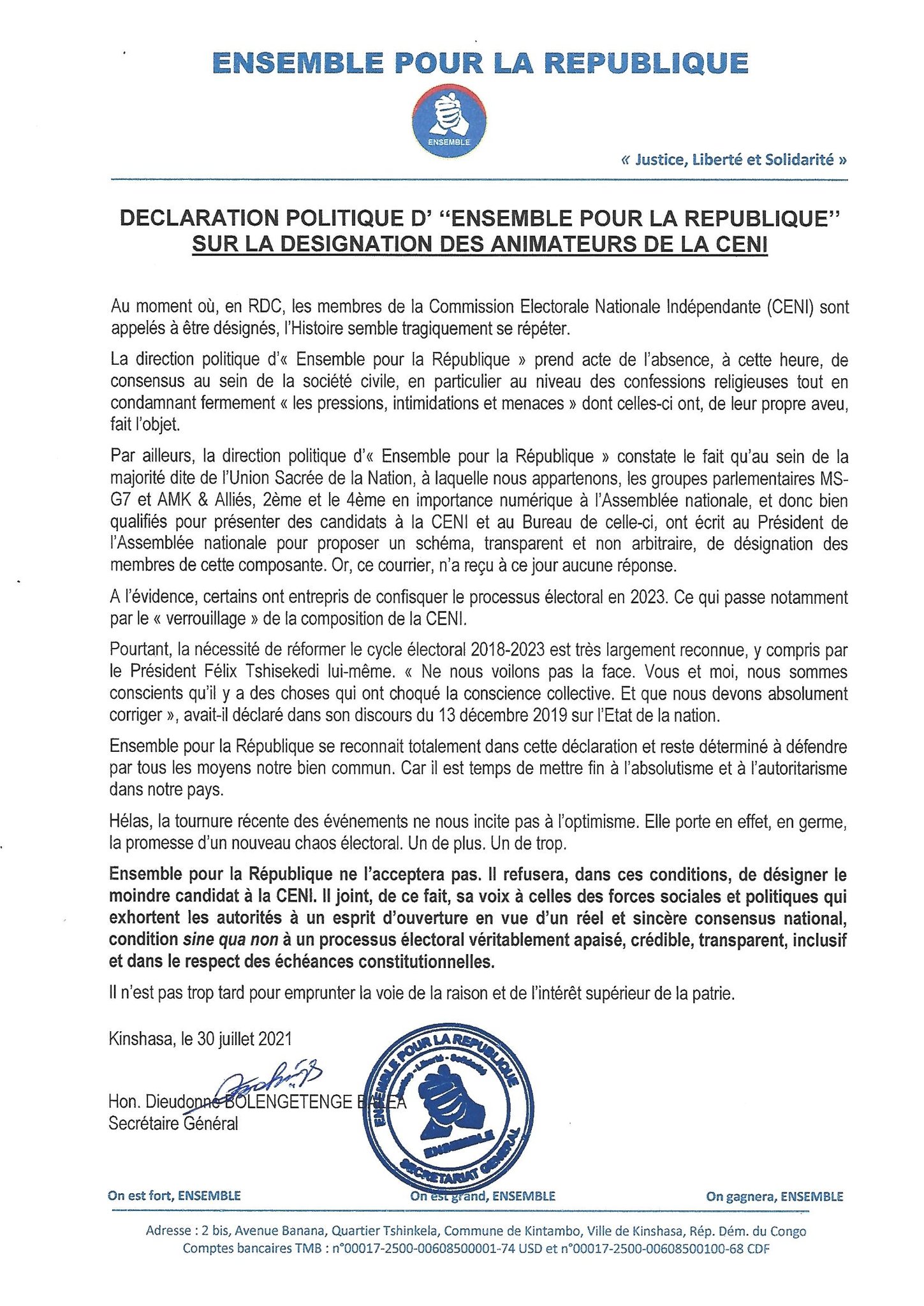 Le parti politique « Ensemble pour la République » a pris position au regard des événements récents liés à la désignation des animateurs de la Commission Electorale Nationale Indépendante (CENI) en République démocratique du Congo .