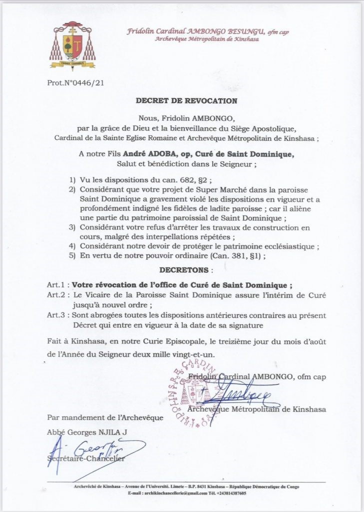 L’Archevêque métropolitain de Kinshasa, le Cardinal Fridolin Ambongo Besungu, a pris un décret pour révoquer le curé de la paroisse Saint – Dominique de Limeté à Kinshasa, en la personne de M. André Adoba , pour violation grave des dispositions en vigueur visant à construire un Super marché, au sein de la parcelle de la paroisse.