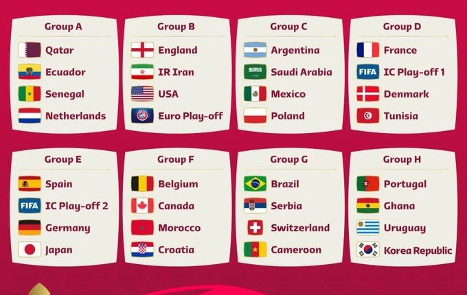 Les 32 nations engagées dans la Coupe du monde 2022, dont 29 sont actuellement connues, sont réparties en huit groupes de quatre. Deux des trois places restantes seront occupées par les vainqueurs des barrages intercontinentaux les 13 ou 14 juin, la dernière place étant déterminée par la voie des barrages de qualification européens, au cours desquels le Pays de Galles affrontera soit l’Écosse, soit l’Ukraine en finale.
