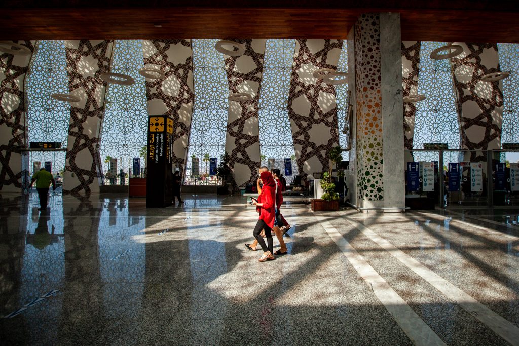 Dans le hall du nouveau terminal de l’aéroport de Fès-Saiss, les premières lueurs de l’aube filtrent à travers de larges baies vitrées, qui rappellent les élégants « moucharabiehs », subtil mélange entre la tradition architecturale du Royaume chérifien et un art plus contemporain.