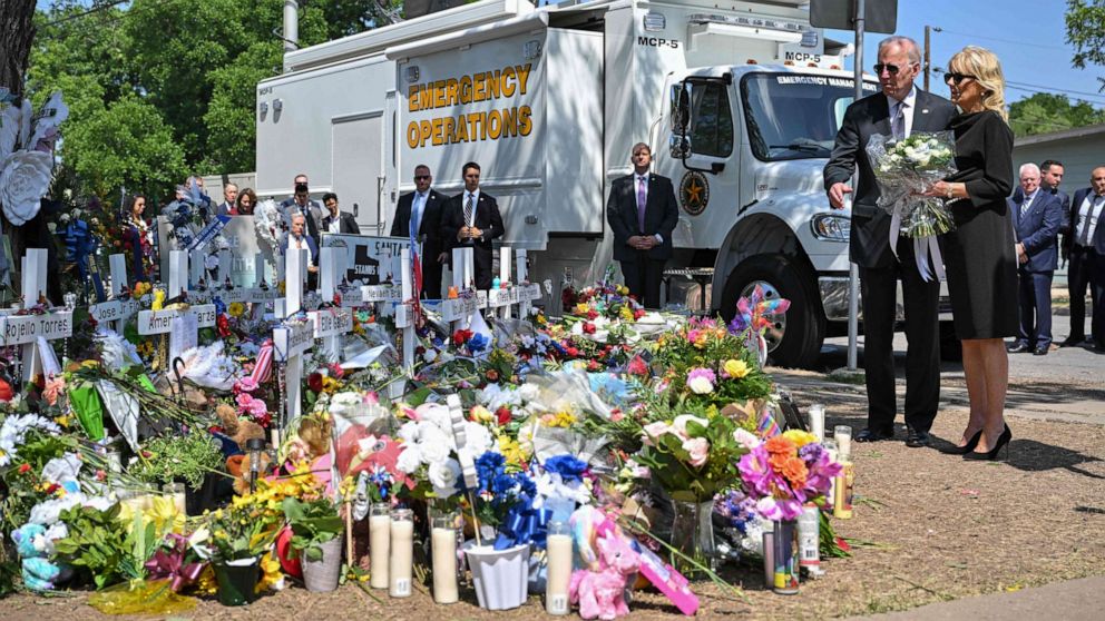 Le président des Etats-unis d’Amérique Joe Biden et la première dame Jill Biden ont effectué le déplacement, dimanche 29 mai 2022, à Uvalde, au Texas, pour pleurer avec la communauté après la fusillade de la semaine dernière dans une école primaire [Robb Elementary School] causant la mort de 19 enfants et deux enseignants.