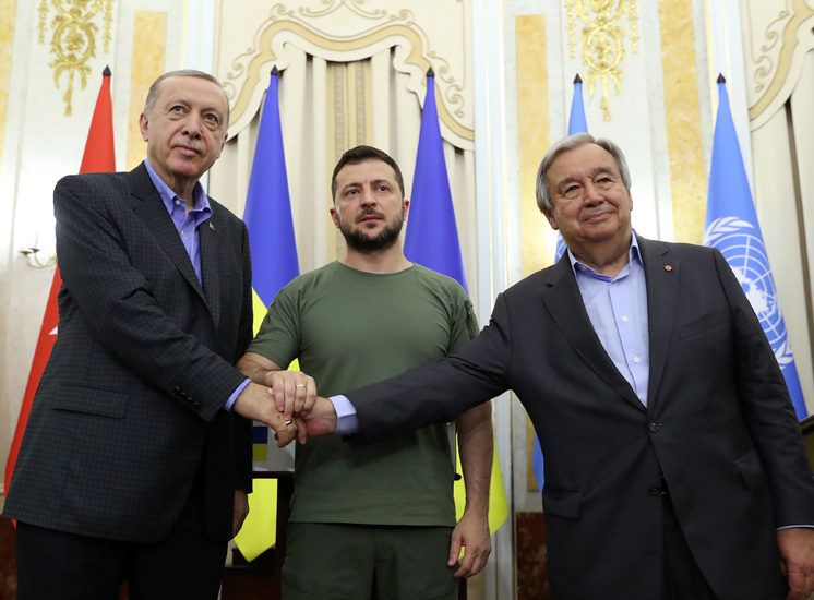 Le président ukrainien Volodymyr Zelensky a accueilli ce jeudi 18 août 2022 à Kiev, le président de la République de Turquie Recep Tayyip Erdoğan et le secrétaire général de l’ONU António Guterres, en visite de travail en Ukraine.