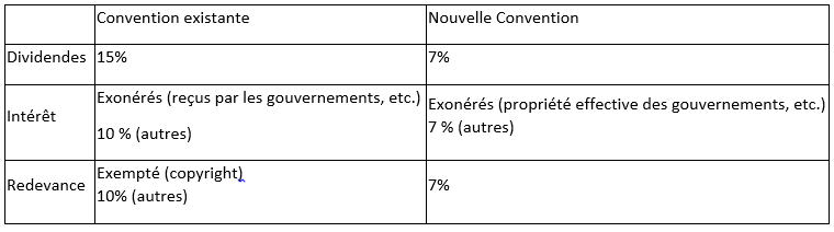 L’imposition sur les revenus d’investissement (dividendes, intérêts et redevances) dans le pays d’origine sera soumise aux taux maximaux réduits ou exemptée comme suit :