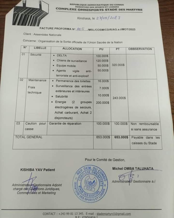 Une facture très salée de 653 000 USD, rien que pour le Stade des Martyrs, lieu ayant accueilli la sortie officielle de l’Union Sacrée de la Nation, alors si l’on tient compte des autres services et tâches liés à l’organisation de cet évènement.
