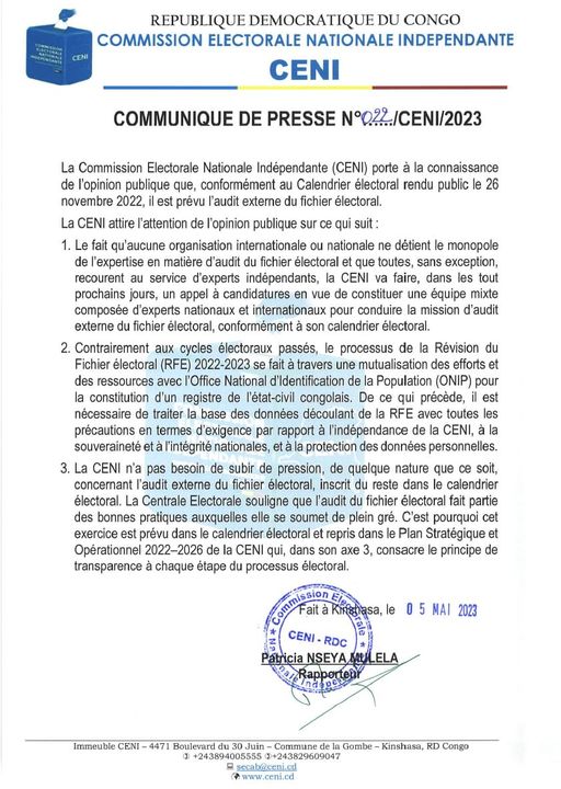 La Commission Électorale Nationale Indépendante (CENI), a annoncé vendredi 5 mai 2023, dans un communiqué, que conformément au calendrier électoral rendu public le 26 novembre 2022, il est prévu l’audit externe du fichier électoral.