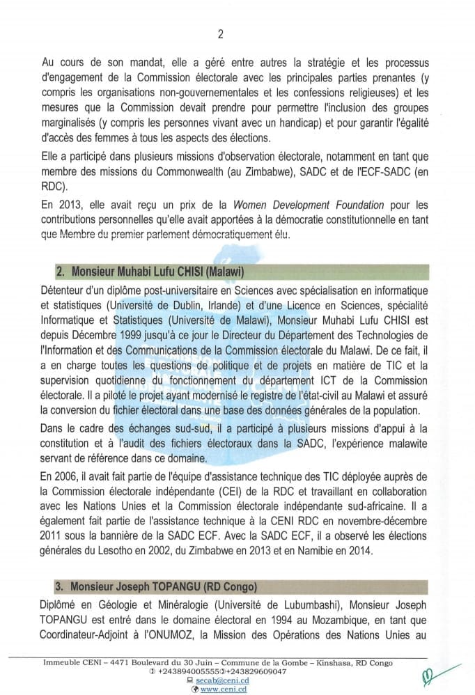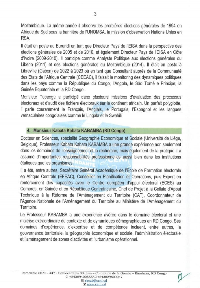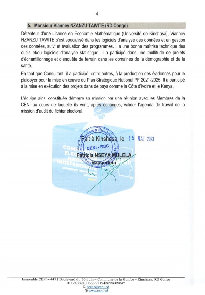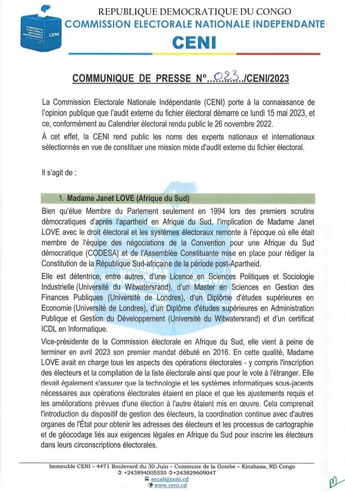 Ce lundi 15 mai 2023, la Commission Électorale Nationale Indépendante (CENI) a rendu publics les noms des experts nationaux et internationaux sélectionnés pour constituer une mission mixte d’audit externe du Fichier Électoral de la République Démocratique du Congo.