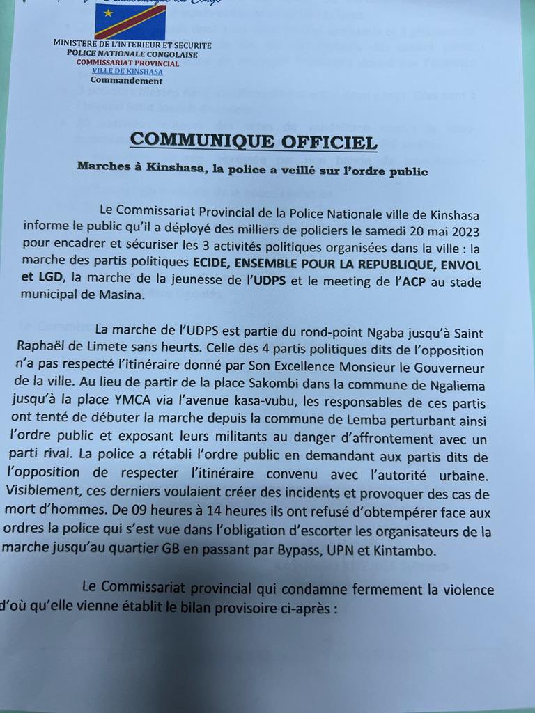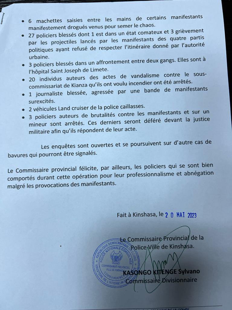 Dans un communiqué consulté par lehautpanel.com, le commissaire provincial de la Police Ville de Kinshasa, Sylvano Kasongo, a annoncé l’arrestation de trois policiers auteurs des actes de tortures sur un mineur lors de la marche organisée ce samedi 20 mai 2023, à Kinshasa par l’opposition.