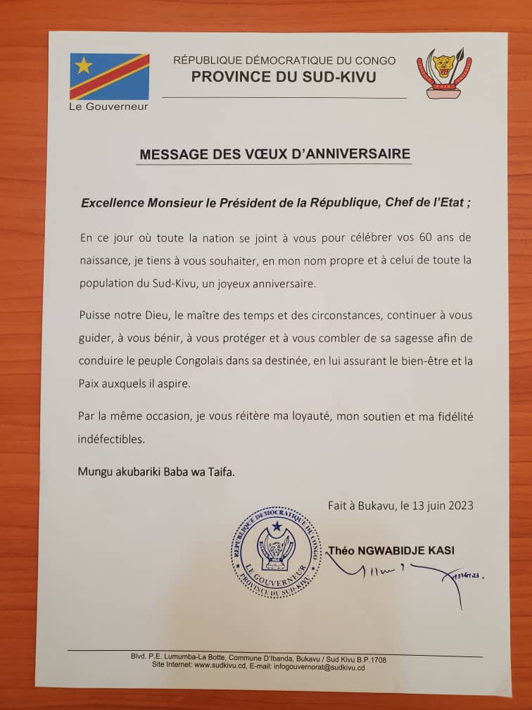 Le Gouverneur de la province du Sud-Kivu, Théo Ngwabidje Kasi, a présenté ce mardi 13 juin 2023, ses voeux d’anniversaire, au Président de la République Félix Antoine Tshisekedi Tshilombo, pour ses 60 ans d’âge.