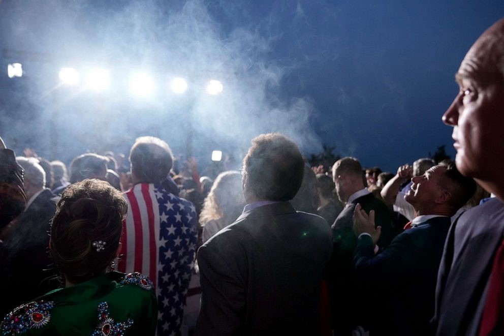 Les invités lèvent les yeux alors qu’un hélicoptère passe à proximité alors que le cortège avec l’ancien président Donald Trump arrive au Trump National Golf Club à Bedminster, NJ, le 13 juin 2023, après avoir plaidé non coupable dans une salle d’audience de Miami plus tôt dans la journée pour des dizaines de chefs d’accusation de crime qui il a accumulé des documents classifiés et a refusé les demandes du gouvernement de les restituer