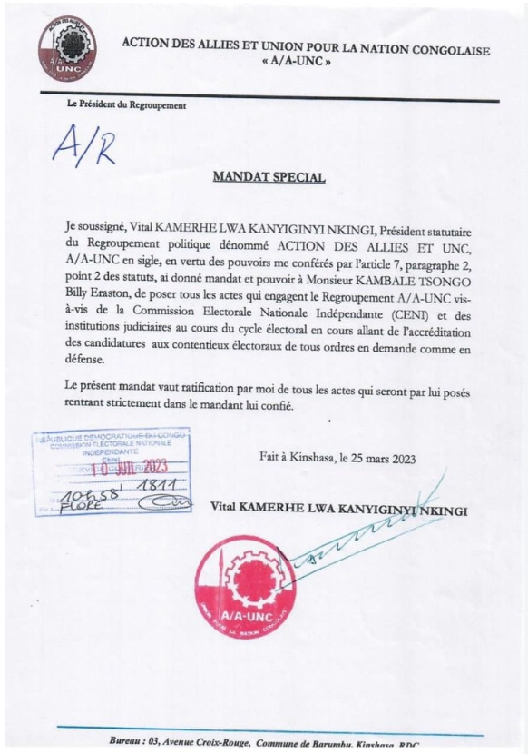 Le Secrétaire Général du parti politique « Union pour la Nation Congolaise (UNC) », Billy Kambale a obtenu l’autorisation d’engager le regroupement « Actions des Alliés et UNC » auprès de la Commission électorale nationale indépendante (CENI), en ce qui concerne le processus électoral en cours.