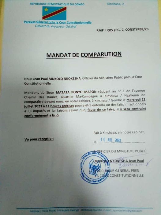 Le Procureur Général près la Cour Constitutionnelle, Jean Paul Mukolo Nkokesha, a envoyé un mandat de comparution, le lundi 10 juillet, à l’ancien premier ministre congolais, Matata Ponyo Mapon, pour y être entendu sur les faits infractionnels lui reprochés.