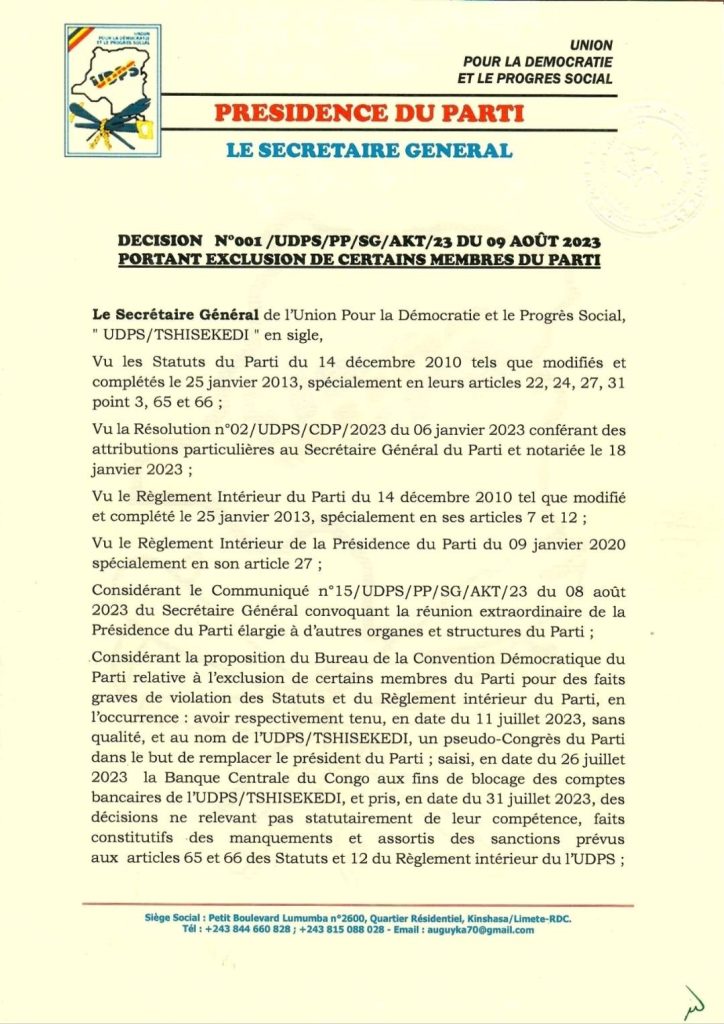L’Union pour la Démocratie et le Progrès Social (UDPS/TSHISEKEDI) a remis de l’ordre dans ses rangs, mercredi 09 août 2023, à l’issue de la réunion extraordinaire qui s’est tenue dans la soirée à la permanence de l’UDPS sous la haute direction du Secrétaire Général Augustin Kabuya.