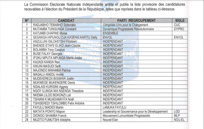 Le rapporteur de la CENI, Mme Patricia Nseya, a fait savoir qu’« Aucune candidature n’a été déclarée irrecevable », lors de la lecture à la télévision publique de la décision portant « publication de la liste provisoire des candidatures déclarées recevables et irrecevables à l’élection du Président de la République ».