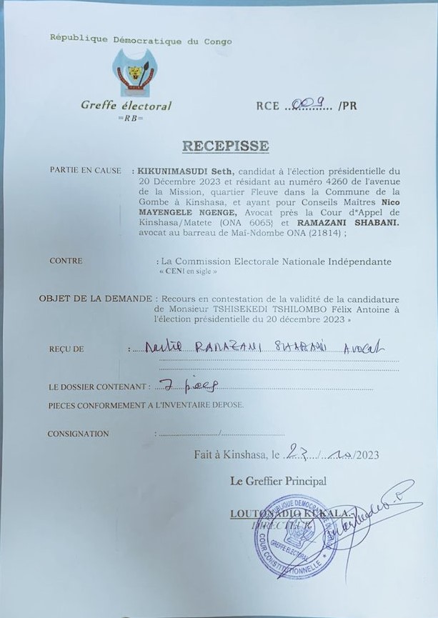 « Nous sollicitons de la Cour Constitutionnelle l’invalidation de la candidature de M. Tshisekedi Tshilombo FELIX ANTOINE pour deux motifs majeurs : défaut de qualité et fraude à la loi. Défaut de qualité, car à l’élection présidentielle de 2018, il avait postulé et proclamé par arrêt de la C.C (inattaquable) sous l’identité de Tshisekedi Tshilombo FELIX, mais à la prochaine élection présidentielle du 20 décembre 2023, il a déposé sa candidature sous une autre identité, à savoir Tshisekedi Tshilombo FELIX ANTOINE, en violation du principe de l’immuabilité du nom consacré en droit congolais. D’ailleurs, c’est à tort qu’il a, 5 ans durant, signé des ordonnances présidentielles sous une identité pirate. Le juriste parlerait de l’usurpation d’une identité d’autrui. La fraude corrompant tout, il appartiendra à la Cour de dire le droit, car tous sont égaux devant la Loi », a écrit le candidat Président de la République, Seth Kikuni, sur X (ex-Twitter).