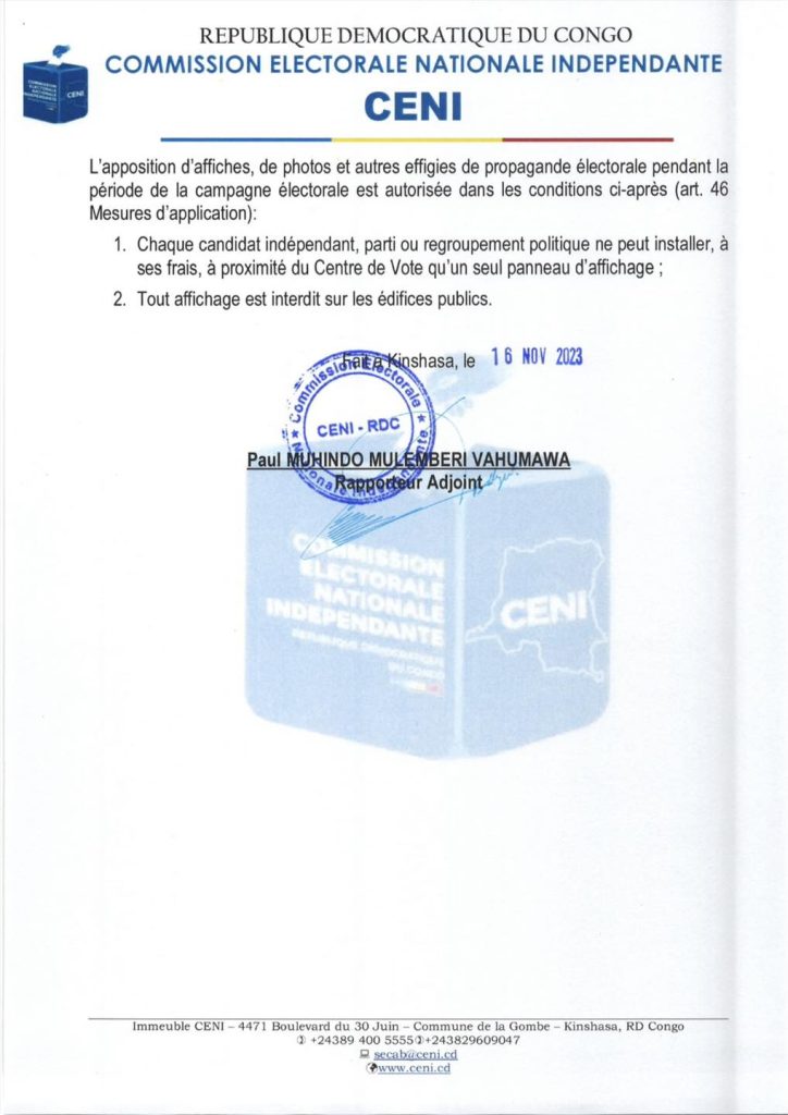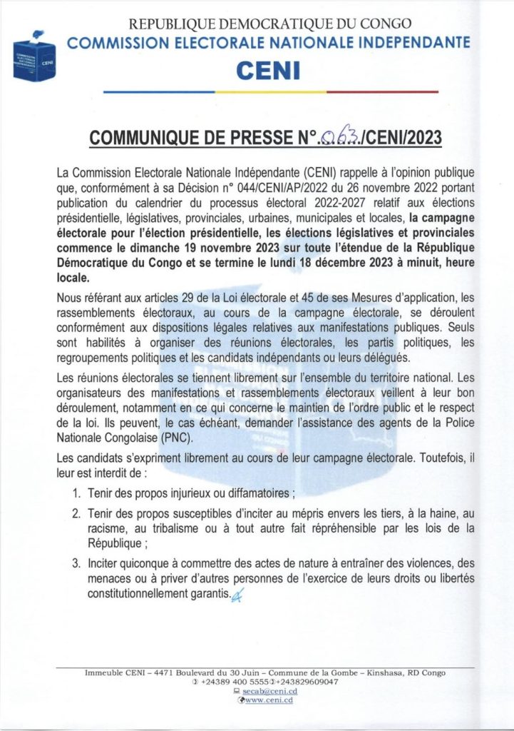 La Commission Électorale Nationale Indépendante (CENI), a publié jeudi 16 novembre 2023, un communiqué de presse n° 063/CENI/2023 relatif au début de la campagne électorale pour l’élection présidentielle, les élections législatives et provinciales, urbaines, municipales et locales.