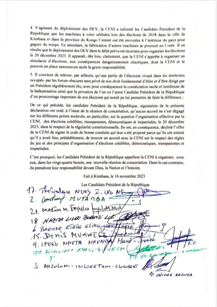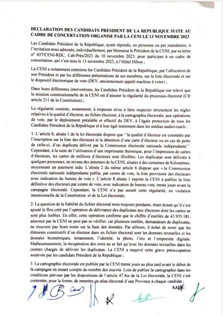 Les candidats président de la République, Théodore Ngoy, Constant Mutamba, Martin Fayulu, Loli Nkema Liloo, Jean-Claude Baende, Denis Mukwege, Marie-Josée Ifoku, Seth Kikuni et Floribert Anzuluni, ont demandé ce jeudi 16 novembre 2023, via un communiqué conjoint signé par eux, à la Commission électorale nationale indépendante (CENI) à organiser dans les prochaines 24 heures un nouveau cadre de concertation avec tous les candidats Président de la République.