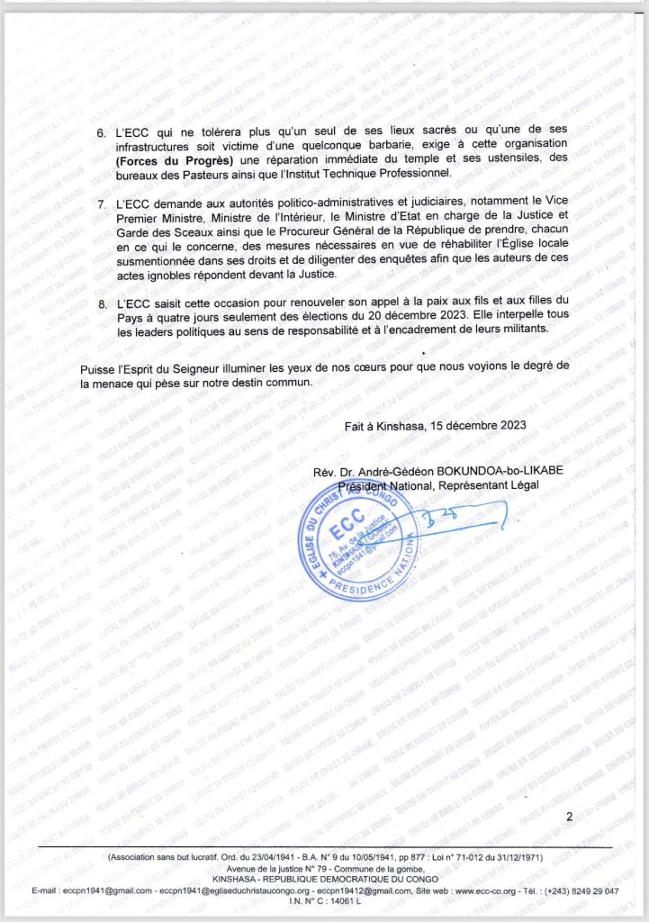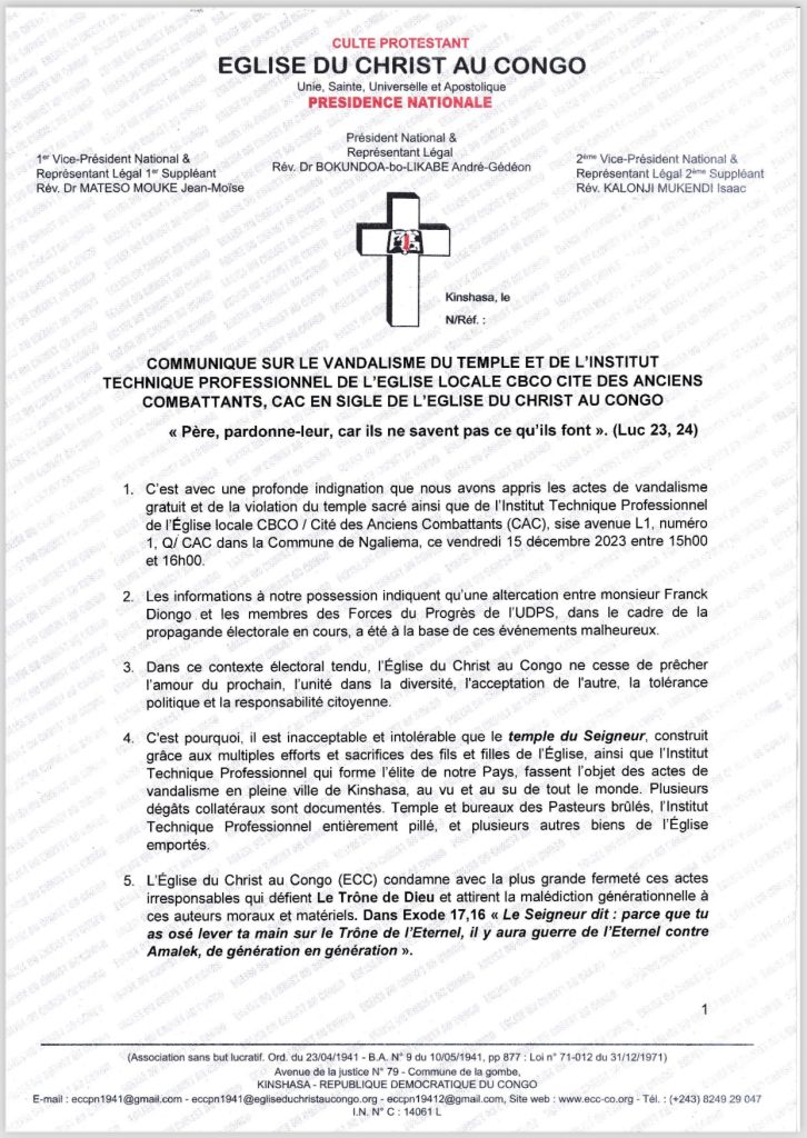 Le Révérend Docteur André-Gédéon Bokundoa-bo-Likabe, représentant légal et président national de l’Eglise du Christ au Congo (ECC) , a condamné avec la dernière énergie, les actes de vandalisme gratuit et de la violation du temple sacré ainsi que de l’Institut technique professionnel de l’Eglise locale CBCO/ Cité des Anciens combattants (CAC), sise avenue L1, numéro 1, Q/CAC dans la commune de Ngaliema, ce vendredi 15 décembre 2023 entre 15h00 et 16h00.