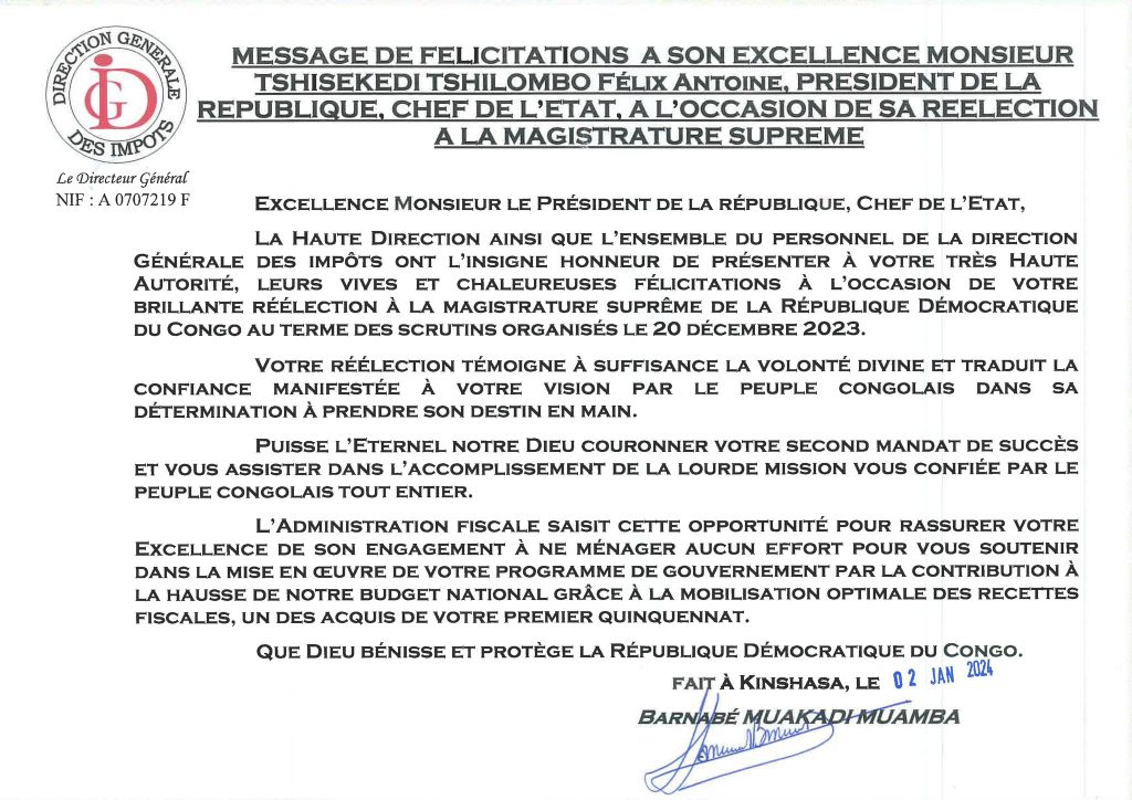 La Haute Direction ainsi que l’ensemble du personnel de la Direction Générale des Impôts ont l’insigne honneur de présenter à votre très haute autorité, leurs vives et chaleureuses félicitations à l’occasion de votre brillante réélection à la magistrature suprême de la République Démocratique du Congo au terme des scrutins organisés le 20 décembre 2023.