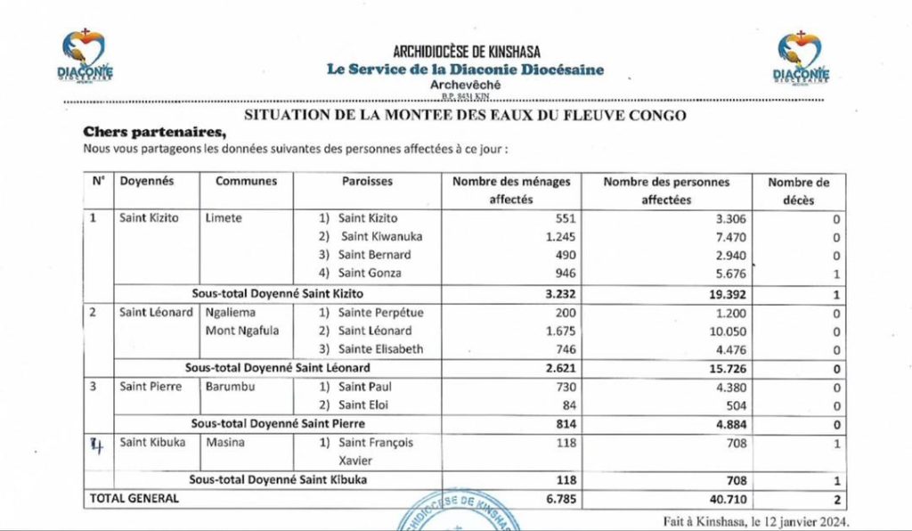 Vendredi 12 janvier 2024, l’Archidiocèse de Kinshasa. à travers son service de la Diaconie a recensé les personnes affectées et les décès enregistrés par la montée des eaux du Fleuve Congo.