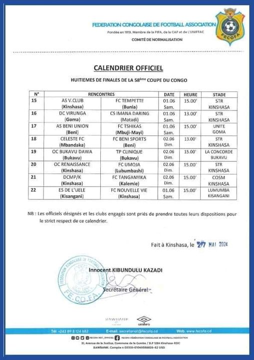 La Fédération Congolaise de Football Association (FECOFA), a publié ce lundi 27 mai 2024, un calendrier sur la phase des huitièmes de finale de la Coupe du Congo de football. Les rencontres se joueront le weekend du 1er et 2 juin prochain.