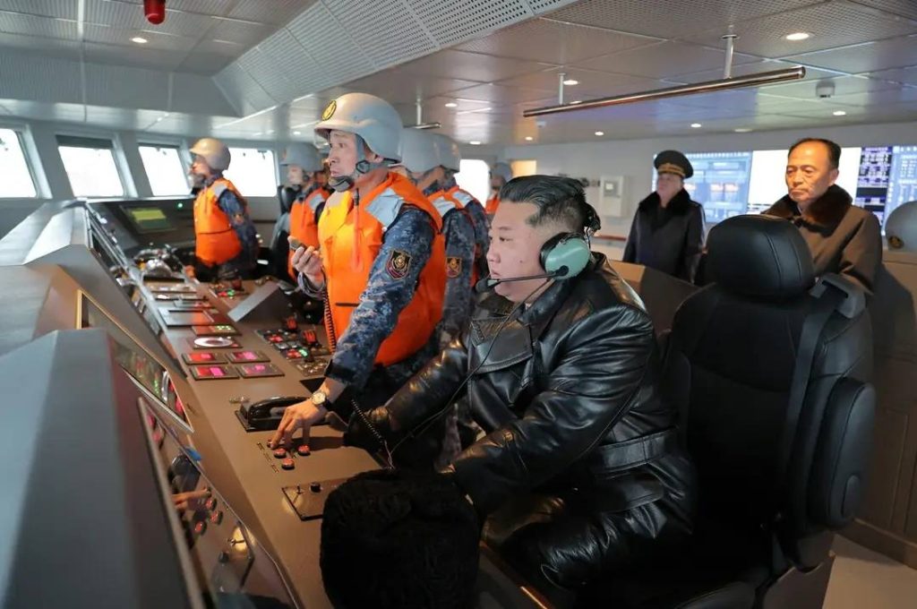 Le 3 mars, Kim Jong Un s’est rendu au chantier naval de Nampo où il a été accueilli par les responsables du secteur de la construction navale. À bord du destroyer, il a assisté à un essai de navigation destiné à évaluer la manœuvrabilité du navire et a salué les performances du système de contrôle ainsi que la préparation de l’équipage.