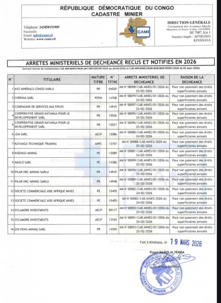 Le Ministère des Mines de la République démocratique du Congo, à travers le Cadastre Minier, a officiellement annoncé la publication d’arrêtés ministériels portant déchéance de plusieurs titres miniers au cours de l’année 2026.